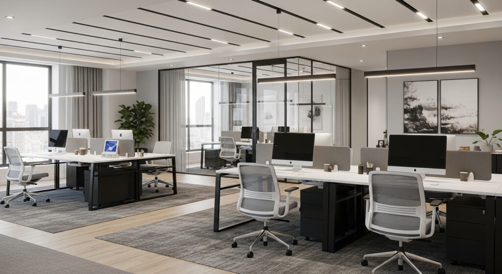 Desenvolvemos ambientes corporativos que refletem a identidade da marca e promovem produtividade. Pensamos cada detalhe para criar espaços modernos, funcionais e acolhedores, alinhando estética e ergonomia às necessidades do negócio.